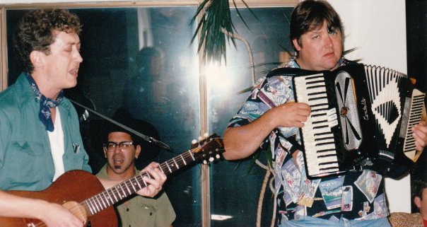 The photo is 3/4 of the original lineup of the Polecats. The version on this recording was the more or less permanent one: RvB, accordion and vox; Broos Campbell, guitar and vox; Chris Mondt, bass and vox; Don Piletic; crazy windup monkey drums. Or conga, in this case.